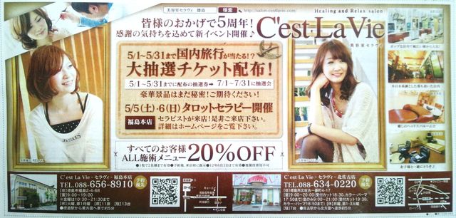 2012年5月2日(Wed) おはようございます。 5月は「5周年記念イベント"第2弾"★」 福島&佐古の両サロンでイベント開催! 期間中にご来店のお客様には、豪華商品が当たる抽選券配布!!! (大抽選会は7月1日〜) 特等は国内旅行が当たる・・・?≧(´▽`)≦ この期間をお見逃しなく★(第3弾はいたしません) http://salon-cestlavie.com/ (↑当サロンホームページ) 月刊イーノ6月号にも掲載中です♪ (ご持参でお得プライスですよ〜!) みなさまのご来店、大歓迎いたします★ 北佐古店もぜひ?ご利用下さいませ(=⌒▽⌒=)