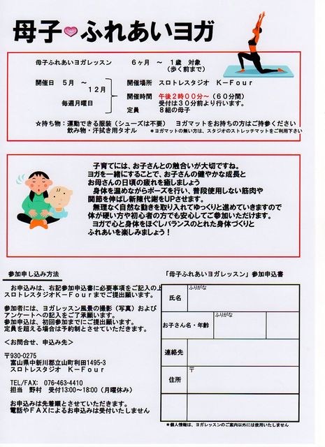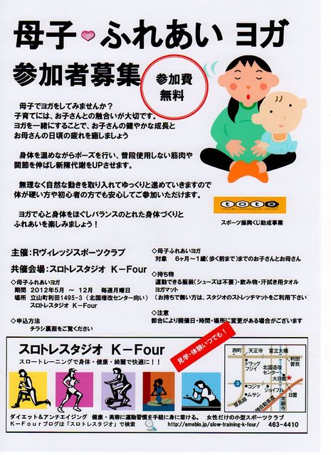 ●母子でヨガしてみませんか● 子育てには、お子さんとの触合いが大切です。 ヨガを一緒にすることで、お子さんの健やかな成長と お母さんの日頃の疲れを癒しましょう。 この母子ヨガは、toto(スポーツ振興くじ助成事業)の 支援事業で、立山町利田を拠点に活動している総合型地域スポ ーツクラブ『Rヴィレッジスポーツクラブ』の主催で実施して おります。 実施日: 2012年5月から12月の毎月曜日 14時から 場 所: 立山町利田1495-3 スロトレスタジオ K−Four 対象者: 6ヶ月から歩きはじ