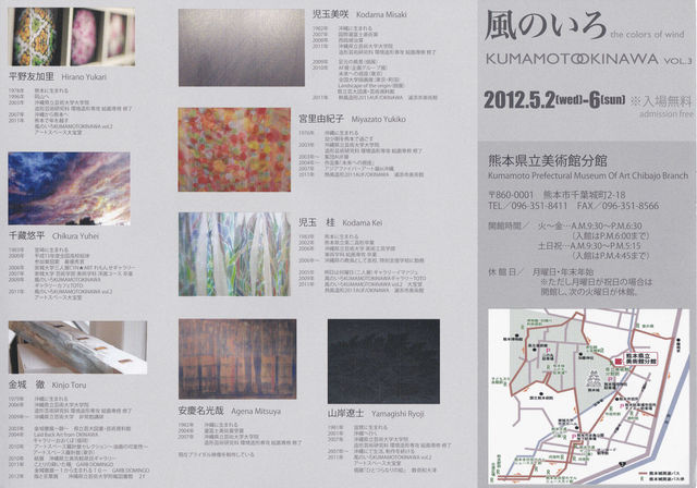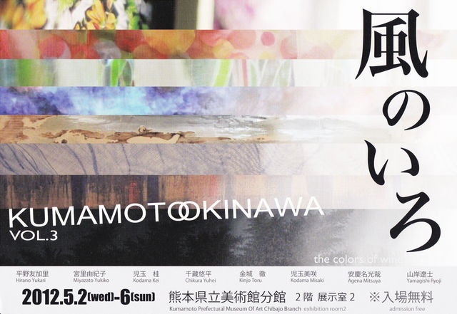 30Aの千藏と申します。 GWにグループ展を開催いたします。お気軽にご来場下さい。 同じく30Aの児玉も出品します。 ------------------------------------------------------------------ 『風のいろ KUMAMOTOOKINAWA vol.3 』 日時:2012.5.2.(水) - 6.(日) 平日 9:30-18:30(入場は18:00まで) 土日祝9:30-17:15(入場は16:45まで) 会場:熊本県立美術館分館 2F・展示室2 ※入場無料 http://branch.museum.pref.kumamoto.jp/php/jyokyo/?tuki=201205 現在、以下の場所に案内状(画像のもの)を設置依頼中です。