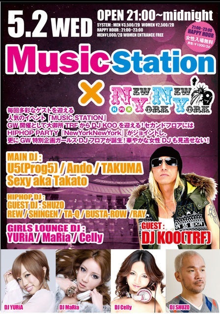 5月2日水曜日(祝前日)渋谷camelot GW SPECIAL特別企画!!   "MUSIC STATION×NEW YORK NEW YORK" 毎回多彩なゲストを迎える人気のイベント"MUSIC STATION"GW開催として大御所TRFからDJ KOOを迎える!! HIPHOPフロアには第1水曜日レギュラー大人気パーティー"NEW YORK NEW YORK"がジョイントし、さらにGW特別企画GIRLS DJフロアが誕生!!1500人規模の鉄板パーティーをお見逃しなく!! ★☆★☆★☆★☆ ゲストお取り出来ますので、お気軽にご連絡下さい!! また、エントランスにて 『ドランカードのゲストで高橋』 と