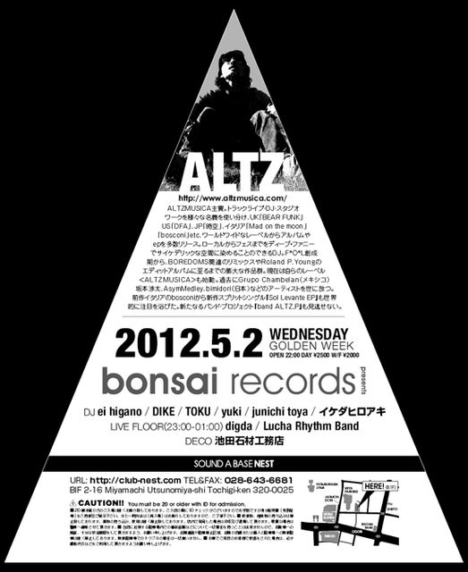 ALTZMUSICA主賓。トラックライブ・DJ・スタジオワークを様々な名義を使い分け、UK「BEAR FUNK」、US 「DFA」、,JP「時空」、イタリア「Mad on the moon」「bosconi」etc、ワールドワイドなレーベルからアルバムやepを多数リリース。ローカルからフェスまでをディープ•ファニーでサイケデリックな空間に染めることのできるDJ。F*O*L創世記から、BOREDOMS関連のリミックスやRoland P.Youngのエディットアルバムに至るまでの膨大な作品群。現在は自らのレーベル<ALTZMUSICA>も始動。過去にG