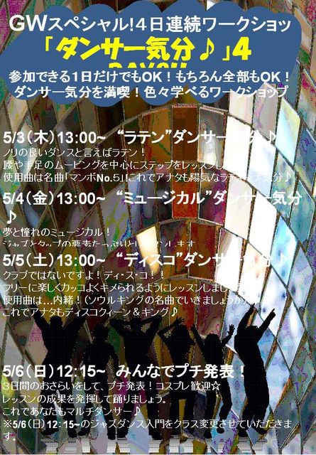 各日完結でダンス初めての方も、ダンスの魅力を堪能出来る連続ワークショップ 基本のステップから、各日のテーマに合わせて振付をマスターします 5月3日(木)13:00〜1400ラテン気分 ノリの良い楽しいダンスといえば、ラテン!! 腰や手脚のムービングを中心に、ステップをレッスン致します。 使用曲はラテンの名曲『マンボNo.5』 これでアナタも陽気なラティーナ気分♪ 5月4日(金)13:00〜14:00ミュージカル気分 夢と憧れのミュージカル!! ミュージカルの要素をタップリとレッスン致します。 使用曲