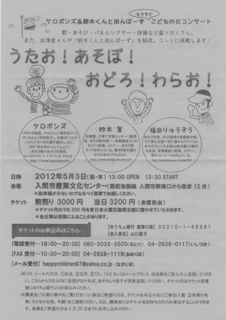 ケロポンズと福田りゅうぞうくんと鈴木翼の4にんで 埼玉県でジョイントコンサートが行われます 歌あり、パネルシアターあり、ダンスあり、あそび歌あり そして、コントもあり、爆笑のステージになること間違いなし!! 関東近辺でなかなかケロポンズさんとジョイントは 少ないので ぜひ!みなさん 遊びにきてください! 場所 埼玉県入間市産業文化センター(西武池袋線入間市駅から徒歩12分) ☆駐車場が少ないので なるべく電車でお越しください) チケット申し込み 電話受付 18:00〜20:00 080−5032