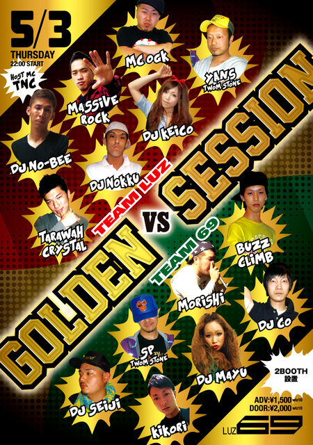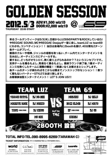 GWの5/3(木)、日頃からLUZ69のPARTYをROCKしている DJやREGGAE SOUND、MCやREGGAE Deejayが一堂会し、 teamLUZ vs team69に別れコンペティション!! 当日は会場内に2boothを設け、40分間を2ターン各チームがPLAY。 普段のクルーの相棒、ジャンルの垣根を取っ払い チーム内でエンターテイメントを生み出しオーディエンスにディールする。 要するに、どっちがオモシロく、熱く盛り上げられるのか?? というコンセプトです!! 支持チームを煽るもよし、見境なく踊るもよし。 最終ラウンド終了後、一番オーディエンスを熱くしたチームに酒類の進呈!!