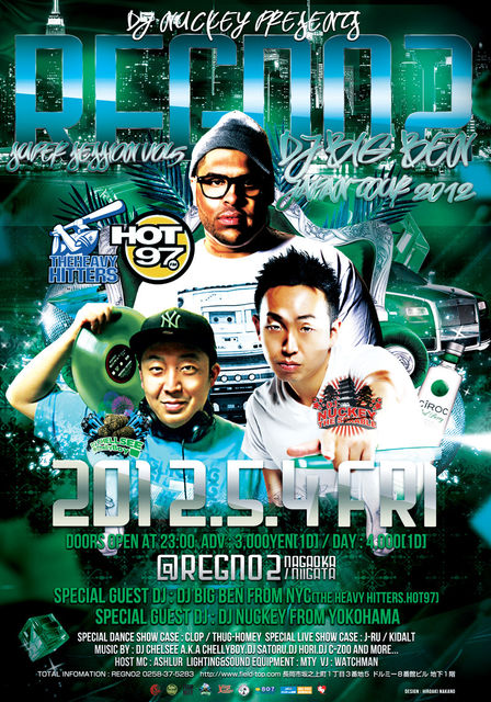 OPEN 23:00 前売り 3000YEN/1D 当日 4000YEN/1D ☆SPECIAL GUEST DJ DJ BIG BEN from NYC(THE HEAVY HITTERS.HOT97) DJ NUCKEY from YOKOHAMA) ☆SPECIAL DANCE SHOW CASE CLOP THUG-HOMEY ☆SPECIAL LIVE SHOW CASE J-RU KIDALT ☆MUSIC by DJ CHELSEE a.k.a ChellyBoy.DJ SATORU.DJ HORI.DJ C-ZOO and more... ☆HOST MC ASHLUR ☆LIGHTING&SOUND EQUIPMENT MTY ☆VJ WATCHMAN ☆TOTAL INFOMATION REGNO2 0258-37-5283 http://www.field-top.com 長岡市坂之上町1丁目3番地5 ドルミー8番館ビル 地下1階