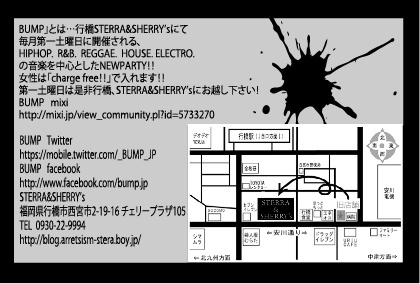 告知失礼致します! BUMP vol3 @行橋STERRA&SHERRY’s 5月5日(SAT) OPEN22:00~ LADYS:charge Free(1drink order) MENS:1000円(1drink order) DJ TAICHI http://mixi.jp/show_friend.pl?id=5617074 ATS http://mixi.jp/show_friend.pl?id=11367147 K.I.D http://mixi.jp/show_friend.pl?id=5646459 BENZO3 http:// mixi.jp /show_f riend.p l?id=99 62867 KO-KA http://mixi.jp/show_friend.pl?id=41309724 MC EYE’S from CRAZY FORCE http://mixi.jp/show_friend.pl?id=13988871 RIC