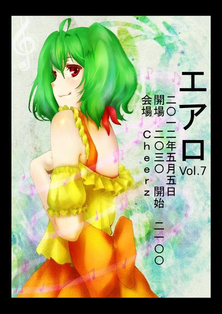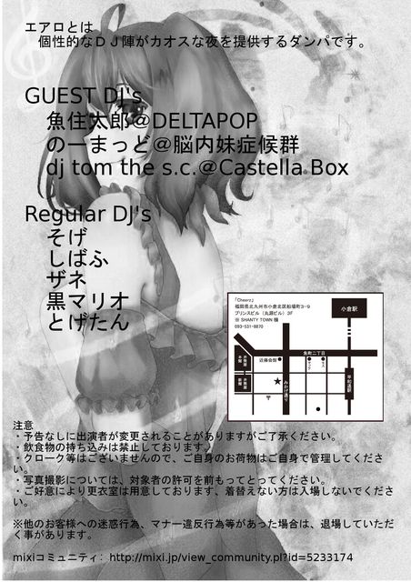 エアロvol7 {CHEERZ} 0935318870 北九州市小倉北区船場町3-9プリンスビル3F 開催日5月5日(土曜日) open 20:30 start21:00 料金1500(1drink付) レギュラーDJ そげ しばふ ザネ 黒マリオ とげたん ゲストDJ 魚住太郎(デルタポップ) のーまっど(脳内妹症候群) dj tom the s.c.(castella box) *エアロとは、アニメ、ニコ動、特撮、ボカロ、東方とヲタに関係ある曲なんでもありのヲタダンパです(`・ω・´)シャキーン コスプレ大歓迎!! ついにvol7開催決定!!な、な、なんと開催日は5月5日!子供の日!