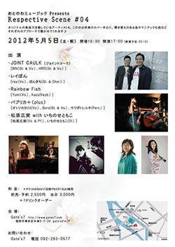 おとのわミュージック Presents 【Respective Scene #04】 ★5月 5日(土・祝) 開場 16:30 開演 17:00 (終演予定 20:10) 【出演】 ※出演順ではありません。 ・ジョイント・コーク ・レイぽん ・Rainbow Fish ・パプリカ+(plus) ・松原広実 with いちのせともこ 会場:Gate's7 ( http://www.gates7.com) 料金:前売 ¥2,500 当日 ¥3,000 +1DRINK O RDER おとのわミュージックHP イベント特設ページ http://otonowamusic.jp/event/20120505.html 前売りチケット取置き可能です♪