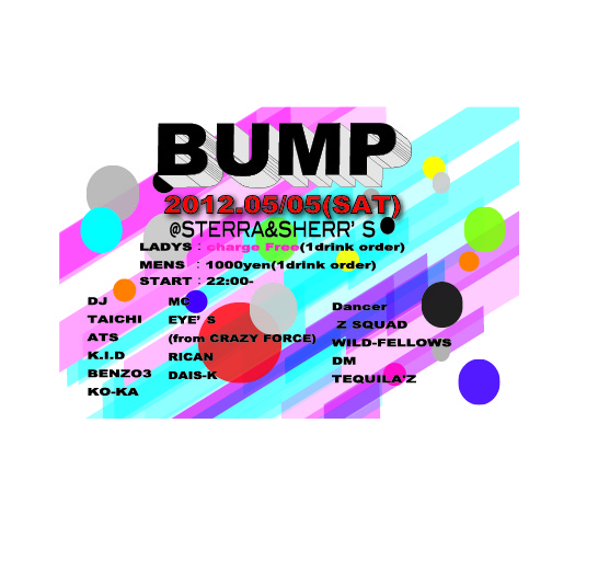 BUMP vol3 @行橋STERRA&SHERRY’s 5月5日(SAT) OPEN22:00~ LADYS:charge Free(1drink order) MENS:1000円(1drink order) DJ TAICHI http://mixi.jp/show_friend.pl?id=5617074 ATS http://mixi.jp/show_friend.pl?id=11367147 K.I.D http://mixi.jp/show_friend.pl?id=5646459 BENZO3 http:// mixi.jp /show_f riend.p l?id=99 62867 KO-KA http://mixi.jp/show_friend.pl?id=41309724 MC EYE’S from CRAZY FORCE http://mixi.jp/show_friend.pl?id=13988871 RICAN DAIS-K Dancer Z SQUAD