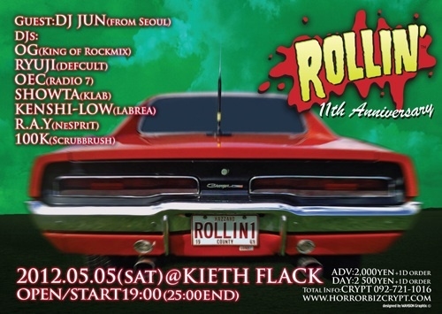 11周年を迎える今回のROLLIN'は、韓国ソウルよりNo.1 ROCK DJ "DJ JUN"をゲストに迎えてのゴールデンウィークスペシャルナイト! 先日開催された新イベント、ROLLIN' outbreak"も絶好調でスタートを切った今年のROLLIN' CREWの勢いを見逃すな!Don't miss it! Guest: DJ JUN(from Seoul) Djs: OG(King of Rockmix) RYUJI(DEFCULT) OEC(RADIO 7) SHOWTA(KLAB) KENSHI-LOW(LABREA) R.A.Y(NeSPRiT) 100K(Scrubbrush) TICKET available at... CRYPT 092-721-1016 RADIO 7 092-734-8511 LABREA 092-732-4625 wizART(d) 092-724-0628