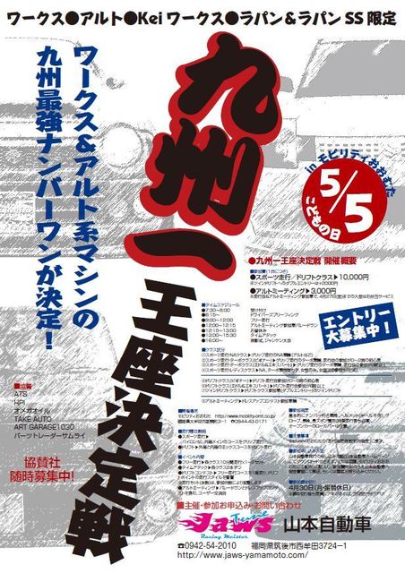 5月5日の子ども日は大人が遊ばんと、どうするね? ということで、この企画が上がったみたいです。 とき:2012年5月5日 ところ:福岡県大牟田市 モビリティおおむた URL http://www.mobility-omt.co.jp/ 参加クラス グリップビギナークラス グリップミドル・エキスパートクラス グリップレディースクラス(女性or女装限定) ドリフトビギナークラス ドリフトエキスパートクラス アルトミーティング 参加車両:車名にアルト、またはワークスとつく車 アルトワークス