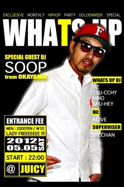 管理人様、告知失礼いたします。 ■2012.5.5 sat @Juicy ■Excluesive Monthly Hip Hop Party 「What's Up 〜GW Special〜」 ■Special Guest DJ SOOP from OKAYAMA ■Start 22:00 ■Price Men 2000yen /with 1D Ladies Free !!!! ■DJ 92 TSU-CCHY NIHO SHU-HEY ■MC ALIVE ■SUPERVISER U-CCHAN 2ヶ月振りのWhat's Up!!今回は、岡山よりDJ SOOPさんをお招きしてのPartyとなります!!!! もちろん、女性はフリーです!!GW終盤もしっかり遊んでいきましょう♪ お待ちしております♪
