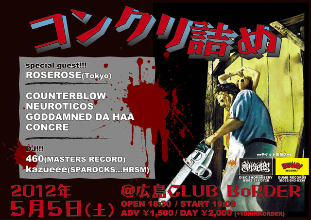 告知失礼しまっす〜♪ 花が輪になる〜♪サークルモッシュの輪がで〜き〜る♪ といったように5月5日こどもの日にピーターパン症候群の大人集めてボーダーで裏フラワーフェスチバルと言ったとこでしょうか久々にコンクリ詰めちゃいます!! 今回もなかなか濃いメンツがそろっとります!!!! ●スケートロックリアルレジェンド!ROSEROSE(東京) 今年で結成29年を迎えながら常にシーンの最前線に立つモンスタースラッシュバンドROSEROSEがスケートロックファン即死のキラーチューンをブチ込んだ新作「SKATETHRASH HEAVEN]を引っ提げ広島