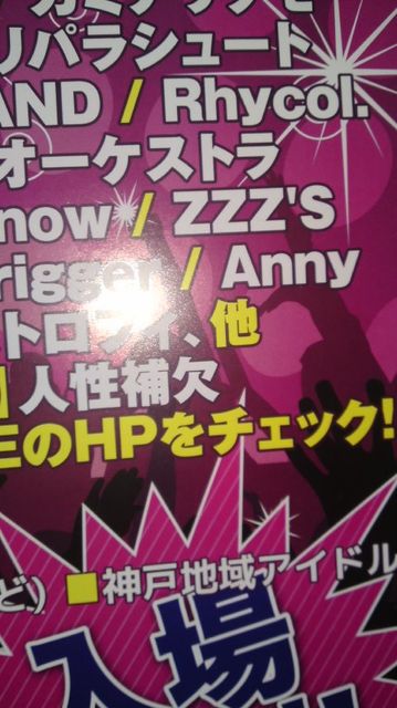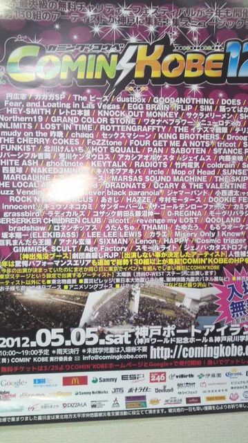 料金はチャリティーイベントなので、募金のみ! Google+、無料モバイル会員、PC会員の3つの方法でチケットを入手できます。 詳しくはCOMIN'KOBE'12特設サイトへ! 総勢150組以上が出演するミュージックフェスティバル!! w)chaqq / dustbox / EGGBRAIN / F.I.B / FLiP / FOUR GET ME A NOTS FoZZtone / GRAND COLOR STONE / HEY-SMITH / HOT SQUALL KING BROTHERS / KNOCK OUT MONKEY / LOST IN TIME NAKED3MINDS / Northern19 / PAN / ROTTENGRAFFTY / SABOTEN / SHANK SiM / SPREAD / THE CHERRY COKE$ / Theピーズ / アルカラ アカシアオルケス