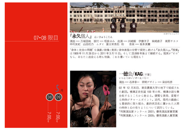 05/08 Tue 19:00 05/09 Wed 19:00 (2組出るうちの後攻なので、早くても 19:50 〜 か。) チケットはゼヒ、当方から。 ココのコメント欄にコメントくだされば、トリオキいたします。 もしくは、こちらメールフォームにて。 http://www2u.biglobe.ne.jp/~hinden/cgi/mail/ 演出 : 万城目 純 振付 : 相良 ゆみ 出演 : 川崎 毅 (劇団 [覚醒微笑]) 柴崎 直子 (劇団 [OM-2]) 高野 チカコ (舞踏) 中村 友紀 (ダンス) 山田 花乃 (?) ムダイ (実験舞踏) 富士栄 秀也 (ネイキッドボイス) 潤湖 (ダンス) 富岡千幸 (揺) ノブナ