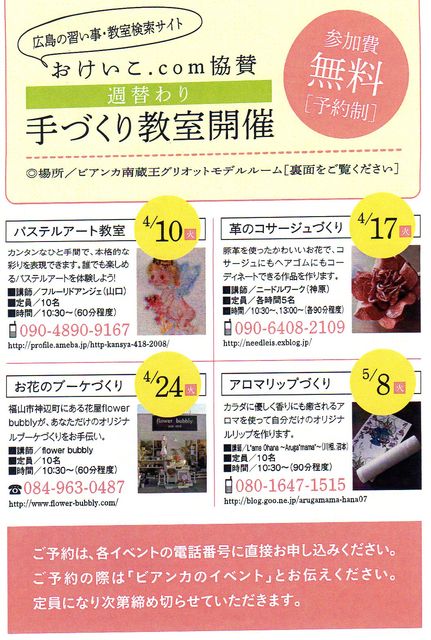 アロマテラピーの手作り教室を開催します 参加、材料費、全て無料となっておりますので、アロマ初心者さんやアロマに触れてみたい方、是非この機会にお申し込み下さいませ 身体に優しく作用し香にも癒される自分だけのオリジナルリップクリームを作りましょう。 精油の説明もいたしますのでお好きな香の調合をお楽しみ下さい お子様同伴もOKです 日時:5月8日(火) 時間:10時30分〜満員 13時00分〜予約受付中 会場:ビアンカ南蔵王グリオットマンション モデルルー