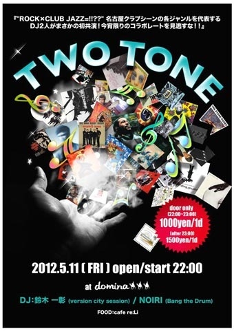 "ROCK×CLUB JAZZ=!!??" 名古屋クラブシーンの各ジャンルを代表するDJ2人がまさかの初共演! 今宵限りのコラボレートを見逃すな!! ■『TWO TONE』 日時:2012年5月11日(金)open/start 22:00 場所:domina http://cafe-domina.com/ 住所:名古屋市中区栄4-3-15丸美観光ビルB1F 052-264-3134 料金:当日のみ1000yen/1d(22:00〜23:00)1500yen/1d(after 23:00) ◎ジャンル:ROCK & CLUB JAZZ 【出演】 DJ:鈴木 一彰 (version city session) / NOIRI (Bang the Drum) FOOD:cafe re:Li http://cafereli.com