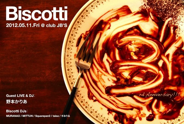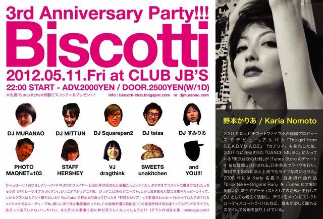 Biscotti ~3rd Anniversary Party!!!~ 会場:栄 JB’S 日時:2012年5月11日(金) 22:00- 料金:ADV.2000yen / DOOR.2500yen(1Drink) GUEST LIVE & DJ:野本かりあ DJ:MURANAO / MITTUN / Squarepan2 / taisa / すみりる VJ:dragthink Photo:MAQNET=103 Sweets:unakitchen STAFF:HERSHEY カアリイがライヴとDJで出演です! お時間のある方はぜひぜひ!遊びに来てください!