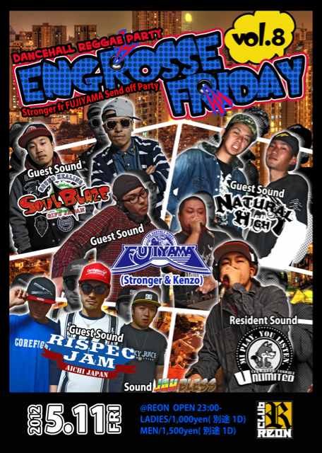 unlimited presents ENGROSSE FRIDAY vol.8 ●REGGEA OPEN 23:00 LADIES 1,000yen MEN 1,500yen ※入場時別途1D代必要 【GUEST SOUND】 FUJIYAMA (Stronger & Kenzo) SOUL BLAZE NATURAL HIGH RISPEC JAM 【SOUND】 JAH BLESS 【RESIDENT SOUND】 unlimited