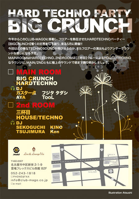 開催場所:CLUB-MAGO 〒460-0007 名古屋市中区新栄2-1-9雲竜フレックスビル西館B2F PHONE&FAX: 052-243-1818 WEB: http://www.club-mago.co.jp/ 日付:5月11日(金) start時間:22:00〜 料金:ADV\1500(1D) DOOR\2000(1D) 【MAIN ROOM】 Party名:BIG CRUNCH ジャンル:HARDTECHNO ●DJs ガスター点 TooL AYA フジタ タダシ ●VJ asaZy 【2ND ROOM】 Party名:三杯目 ジャンル:House/Techno ●DJs SEKOGUCHI tsujimura KINO Ken 案内文: 今年からこのCLUB-MAGOに