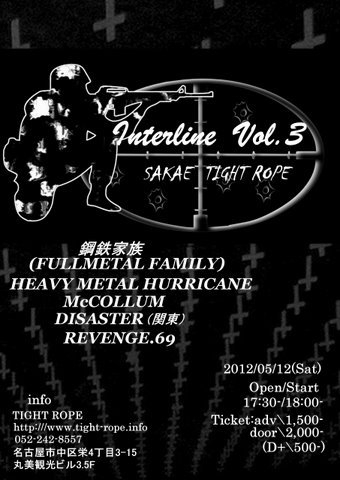 名古屋でのライブが実現しました。 Revenge.69さん、ありがとうございます。 当日、2nd Demo CD-R "Inspired My Brain"を配布する予定です。 Tight Rope presents "Interline Vol.3" venue: 名古屋栄 Tight Rope http://www.tight-rope.info/ date: 2012-05-12 (sat) time: open 18:00 / start 18:30 (予定) charge: adv 1,500 yen / door 2,000 yen (ドリンク別 500 yen) act: Revenge.69 http://www.youtube.com/watch?v=xXkqMOpviVE&feature=related Disaster http://www.myspace.com/disastergoahead Heavy