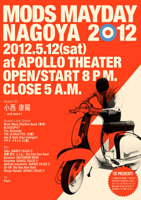 『MODS MAYDAY NAGOYA 2012』 1990年に誕生して以来今年で23年目を迎える「MODS MAYDAY NAGOYA」。 名古屋を中心に60sシーンで活動するバンドとDJに加え、全国各地でシーンを支えるゲストを多数お招きして開催される、名古屋の全てのMODSや60sフリークにとって特別なMODSの祭典。 今年は6バンド、9DJの豪華な出演陣。名古屋の主要MODイベント「DANCE CRAZE!」「Da Doo Ron Ron」「MAXIMUM MOD」によるフルサポートで熱い夜を演出する。 この特別な日のためにオーダーしたスーツでキメたモッドや、60sなワンピースで着飾るモデット、クールな