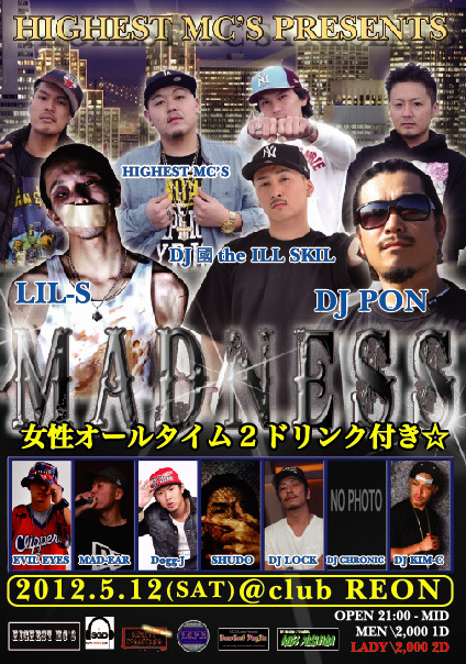 Highest Mc's Presents 〜MADNESS Vol.02〜 ●HIP HOP OPEN 21:00 CLOSE MID MEN 2,000 1D LADY 2,000 2D 男性オールタイム1ドリンク付き 女性オールタイム2ドリンク付き 【GUEST DJ】 DJ PON 【DJ】 LOCK 國 KIM-C CHRONIC 【LIVE】 LIL-S EVIL EYEZ MAD EAR DOGG-J SHUDO Highest Mc's 三河発祥のHIP HOP NIGHT!MADNESSが迎える今回のSPECIAL GUESTにDJ PONが登場する!解るはずもないラッパーの俺が感じた、DJとしてのフロアへの存在感、選曲やスキルうんぬんはあえて置き、一番届い