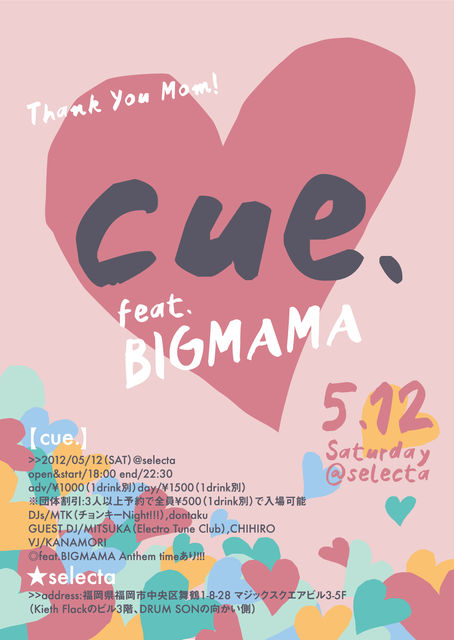 shin@MTK 管理人様いつもお世話になっております。 貴重なスペースお借りいたします。 【cue.】とは、ライブ感覚で参加できるROCK-DJイベント。福岡県拠点に開催。ライブ感覚で参加できるため初心者の方や一人参戦の方も多い。デイタイム開催なので未成年の方も参加できる。楽しみ方は自由で好きな音楽でわちゃわちゃ騒ぎ踊ったり、お酒を飲みながら会話を楽しんだり、様々な楽しみ方ができるイベントである。 >>offical HP http://cue2011.jimdo.com/ サークル・モッシュだって大歓迎!!!!!! 皆様のお越しをDJ,STAFF一同