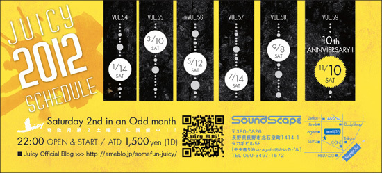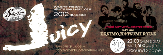 ★SOMEFUN PRESENTS HIPHOP,R&B PARTY JOINT since2003★ Juicy =VOL.56= ☆☆☆10th years rushing in !!!☆☆☆ 今回は… 4月、5月生まれの多いJuicy-Crewですので、 まとめてBirthday Bushみたいにやちゃおっかなー!!!・・・って予定ですので、 一緒にお祝いしていただけると嬉しいです!! 2012/05/12 @SoundScape(長野市) ☆REGULER DJ'S : EZ,SIMO,K@TSUMI,RYU-Z 22:00 OPEN & START / ATD:1,500yen(1D) …ということで、10年目突入!! 今年も “来た人だれもが楽しめる全員参加型の空間” を皆さん