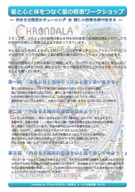 ****************************************************** フライヤー(JPEG) → http://urx.nu/XPn 印刷用フライヤー(PDF) → http://urx.nu/XPB mixi → http://urx.nu/XPI Facebook ページ http://urx.nu/XXd ****************************************************** 2012年。5月21日の金環日食と6月6日の金星日面通過を間近にわたしたちの宇宙への関心と意識はますます高まってきています。 そんななか5月の12日と13日にインド占星学家ミチユウとプラネットセラピスト上田芳久 とコラボ企画にて星の智恵の集大成