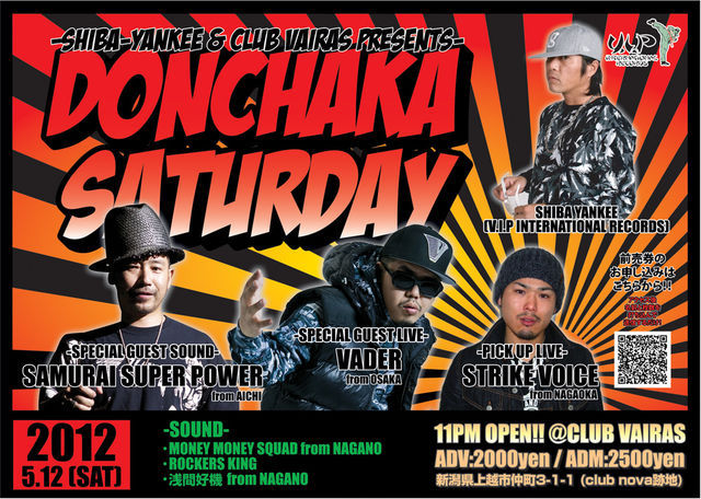 2012.05.12 (SAT) 【DONCHAKA SATURDAY】 23:00 OPEN!! @CLUB VAIRAS 新潟県上越市仲町3-1-1(club nova跡地) ADV 2000円 ADM 2500円 SHIBA-YANKEE http://mixi.jp/view_community.pl?id=2955058 -SPECIAL GUEST LIVE- VADER from OSAKA http://mixi.jp/view_community.pl?id=254583 -SPECIAL GUEST SOUND- SAMURAI SUPER POWER from AICHI http://mixi.jp/view_community.pl?id=139307 -PIC UP LIVE- STRIKE VOICE from NAGAOKA -SOUND- MONEY MONEY SQUAD from NAGANO (SOUND