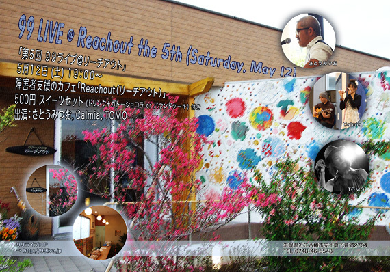 ☆99 LIVE @ Reachout the 5th (Saturday, May 12) 満員御礼記録更新中です 「第5回 99ライブ@リーチアウト」 [date] 5月12日 (土) [start] 19:00〜 [place] 障害者支援のカフェ「Reachout(リーチアウト)」 [charge] 500円 スイーツセット(ドリンク+ガトーショコラ or パウンドケーキ) 付き [act] さとうみつお,Calmia,TOMO 詳細は → http://99live.jp 携帯の方は → http://99live.jp/i/ フライヤの拡大 → http://99live.jp/history/reachout_05_l.jpg 過去動画(YouTubeチャンネル) → http:/