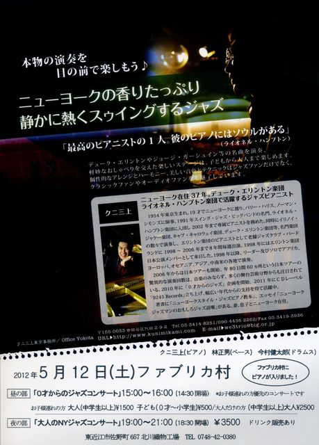 ニューヨーク在住のクニ三上さんのジャズピアノコンサートです。 出演 クニ三上(ピアノ) 林正男(ベース) 今村健太郎(ドラム) 開催日:5月12日(土) ?昼の部 14:30開場 15:00~16:00頃まで 『0歳からのジャズコンサート』。赤ちゃんのうちから良い音楽を聴かせて心豊かなお子様に育てましょう。 ☆料金 お子様連れの大人一人(中学生以上)1,500円、 お子様(0歳~小学生)500円 大人だけの方(中学生以上)2,500円 つまり親一人につきお子様一人で2,000円、ご夫婦とお子様一人で3,500円です。 (お子様一人追加ごと