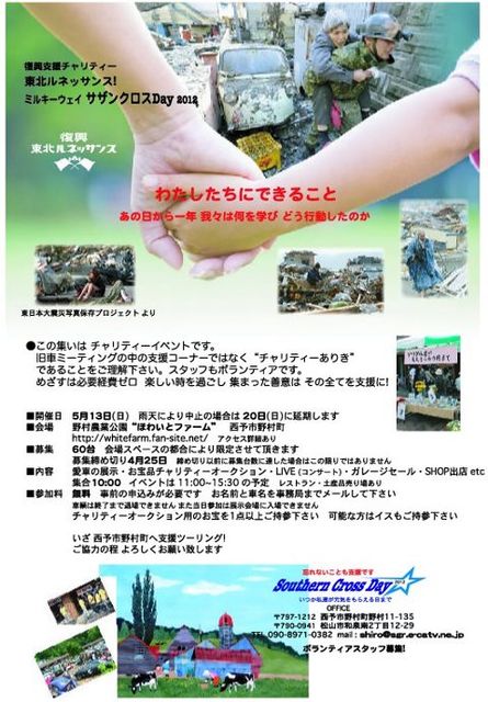 復興支援チャリティー 東北ルネッサンス ミルキーウェイ サザンクロスday 2012 5月13日(日)雨天の場合は20日に順延 野村森林公園 ほわいとファーム 今年で2回目の旧車ミーティングをかねたチャリティー・イベントです。 近隣の方、是非遊びに行って下さいませ!