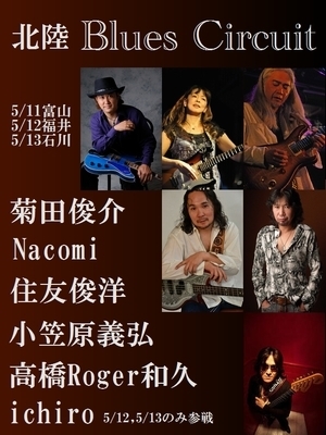 新緑の5月。 さてさて「コラーゲンズ@東北」が終わるとお次は北陸です。 今年も北陸 Blues Circuit 2012、今回もこんな豪華メンバーで参ります。 どうぞみなさん、早々にご予約を。 ◆◆◆◆◆◆◆◆◆◆◆◆◆◆◆◆◆◆◆◆◆◆◆◆◆◆◆◆◆ 北陸 Blues Circuit 2012 【出演】 菊田俊介(g,v) Nacomi(g,v) 住友俊洋(g,v) 小笠原義弘(b,v) 高橋"Roger"和久(d,v) ichiro(g,v) 5/12, 5/13のみ -------------------------------------------- 5月