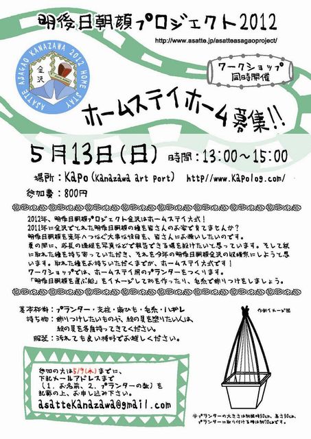 ワークショップのお誘いです。 2007年に金沢21世紀美術館を彩った明後日朝顔プロジェクトですが、その後毎年継続して種の記憶を重ねています。 そして2012年、明後日朝顔プロジェクト金沢はホームステイ方式です。 2011年に金沢でとれた明後日朝顔の種を皆さんのお家で育てませんか? 明後日朝顔を来年へつなぐ大事な役目を、皆さんにお願いしたいのです。 夏の間に、成長の過程を写真などで報告できる場を設けたいと思っています。 ... そして秋に取れた種を持ち寄っていただき、それを今年の明後日朝顔金沢の収穫祭にしようと思います