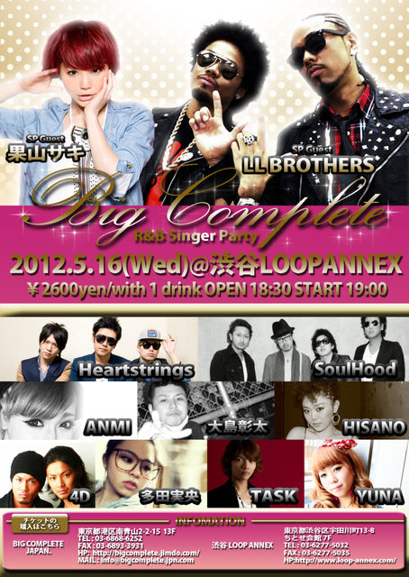 管理人様告知失礼します。 5/16(水)に毎月開催中のライブイベント「BIG COMPLETE」が開催されます♪♪ 今回はスペシャルゲストに、LL BROTHERS、果山サキを迎え、 豪華なライブステージになること間違いなしです!! 是非以下チェックして下さい☆! イベント詳細です ↓↓↓ 2012/5/16(水) 【BIG COMPLETE】 @渋谷LOOP ANNEX OPEN: 18:30 GENRE: HIP HOP / R&B / POPS/ HOUSE ■スペシャルゲスト LL BROTHERS 果山サキ ■LIVE Heartstrings ANMI TASK 大島彰太