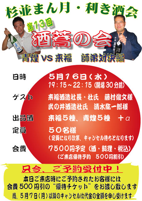 第13回目の酒蕎の会は、茨城県・来福酒造『来福』の藤村俊文社長(杜氏)と山梨県・武の井酒造『青煌』の清水紘一郎杜氏をゲストにお招きし、師弟対決と銘打ったコラボ会を開催致します。 詳細は決まり次第、随時UPします。 mixiでは、下記注意事項をご確認のうえ、ご予約下さいませ。 ★ご予約受付開始日★ 3月16日(金)より、ご来店、お電話、mixiコミュより受付開始致します。 尚、ご予約頂いた方で、開催日までに一度ご来店頂くと、会費が少しお得(500円OFF)になる“ご優待チケット”をお渡し致しますので、お電話、
