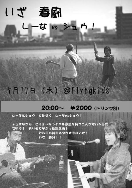 おじゃまいたします〜 毎度おなじみしーなとシュウです。 要チェックライヴのお知らせをさせてくださいませ* 『 いざ春闘! しーな VS シュウ 』 5月17日(木) フライングキッズ (広島市中区鉄砲町8-24 2F TEL:082-224-4692) 20:00〜 ¥2000(ドリンク別) しーなとシュウではなくて「しーな VS シュウ」 バーサス!対決です! デュオながら もともとそれぞれ「ソロで演ってなんぼ」の活動が長かったふたりですので、 ビミュ〜なライバル意識がありまして、、、 ここらでいっちょ「決着」をつ