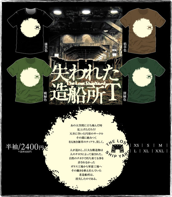 製作決定いたしました。 【O-project×maniapparel】 この国の南の地にある朽ち果てた 巨大な老造船所が このセカイから消え落ちた。 あの場所が持っていたオーラの全てを とても1枚のTシャツに 封じ込められるとは到底思えない が、僕は、僕の想いを封じ込める事もまた無理なのだ。 天井から放たれた光の矢に 打ち抜かれたあの時の気持ちがそう呟くのだ。 この大切なモチーフには笑いも可愛さも 解りやすい観光地的表現も求めない 僕の記憶に残る断片をアウトプットするだけ。 そんな我が侭に付き合ってくれるのなら オファーい