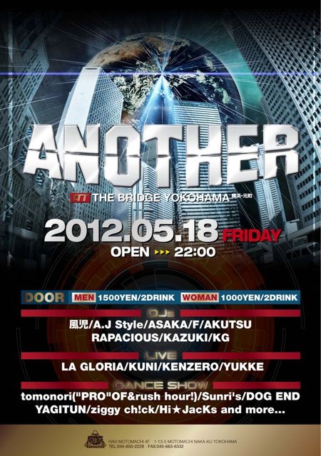 管理人様、告知失礼します。不適切な内容でしたらお手数ですが削除お願いします! 明日から横浜・元町@THE BRIDGE YOKOHAMAにて新しく始まるイベント、ANOTHERが開催されます! BRIDGEのエントランスにてエフのゲストと言っていただければ、男性1500円/2DRINK!女性1000円/2DRINKとお安い価格で入場出来ますので是非遊びに来てみて下さい! 以下、詳細です! ANOTHER vol.1 @THE BRIDGE YOKOHAMA 横浜・元町 2012.05.18.[FRI] OPEN / 22:00 〜 [DOOR] MEN 1500円/2DRINK WOMAN 1000円/2DRINK [DJs] ・風児 ・A.J Styl