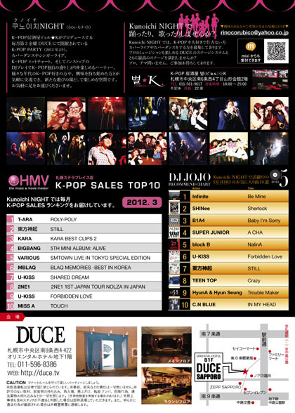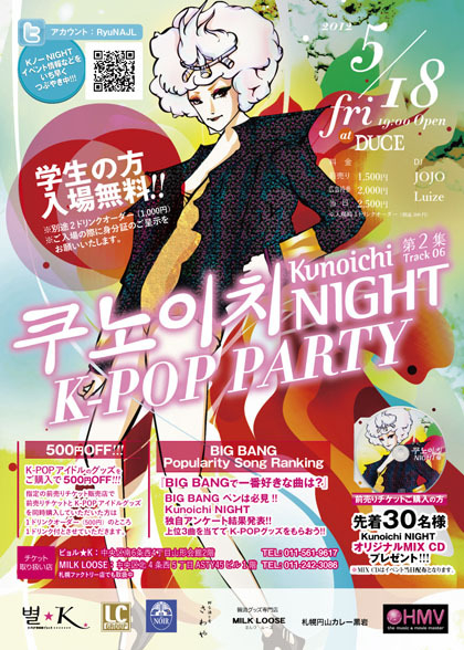 K-POP居酒屋ビョル★Kがプロデュースする毎月第3金曜日開催されているK-POPパーティーです。カバーダンスやシンガーライブ、K−POPヒットチャート、そしてノンストップのDJプレイでK-POP独自の盛り上がりを楽しめるパーティー。様々な年代のK-POP好きの方や興味を持ち始めた方とが気軽に交流でき、新たな遊びの場として楽しめる空間です。 それでは、次回の【Kunoichi NIGHT】は、5月18日の金曜日開催となっております。 たくさんのご来場をお待ちしております☆☆ 前売りチケットは、アスティと4プラにある韓流グッズ専門店『ミ