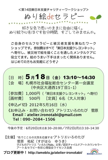 管理人様、貴重なスペースをお借りします。 円山で子どものアトリエを主宰しておりますボギーと申します。 今回は、大人対象の「ぬり絵deセラピー」のご案内です。 さわやかな風の色、ふわりと舞う花びらの色、大好きなメロディーの色。 気持ちがいいと感じる色を塗っているうちに、忙しい日常からはなれ イメージした世界をゆったりと旅しているような気分に。 好きな色で自由に描き、心をほぐす自分時間、過ごしてみませんか? 絵のうまい下手は関係ありません。はじめての方もお気軽にどうぞ。 ご参加おまちしております。(要予約)