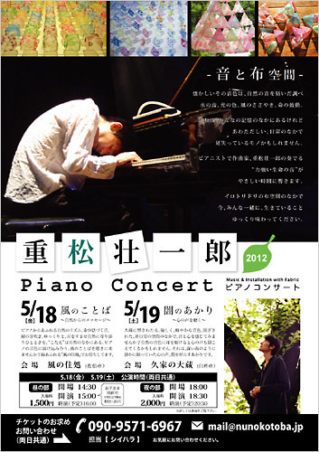 ━━━━━━━━━━━━━━━━━━━━━━━━━━━━━━━━━━━━ 「風のことば〜自然からのメッセージ」 重松壮一郎ピアノ・コンサート ━━━━━━━━━━━━━━━━━━━━━━━━━━━━━━━━━━━━ とき: 5月18日(金) 会場: 風の住処 http://kazenosumika.net (大分県佐伯市木立5031-5 / tel: 0972-29-2798) 時間: (1)昼の部 開場14:30 コンサート15:00-16:00(1時間)※お子様連れOK (2)夜の部 開場18:00 コンサート18:30-20:30(2時間)※大人向け 料金: (1)昼の部 1500円(高校生10