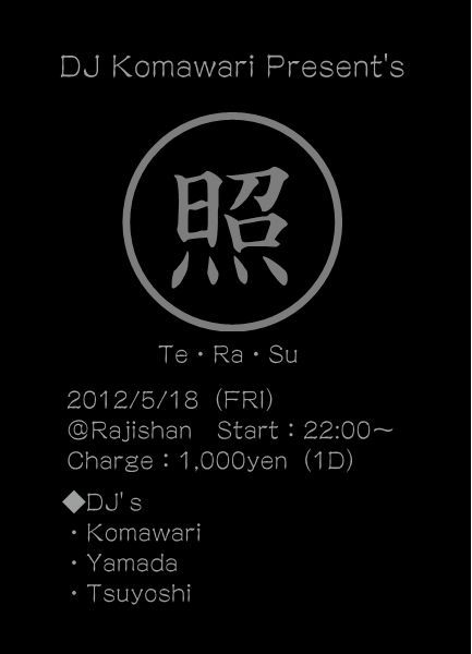 管理者様、イベントの告知をさせていただきます。 不適切であれば、削除お願いします。 DJ.Komawari PRESENTS [Te・Ra・Su] House,Techno,Ambient ****************** 5.18(fri) START 22:00 FEE:\1000(1drink) Rajishan. ---------------------- DJs: Tsuyoshi(Ribe&Play/Techno Brake) Yamada & Tres bien a.k.a Komawari(VITAMIN!/club ABSENTE) *************************** Rajishan. 静岡市葵区両替町2-7-11 SKTビル 1F