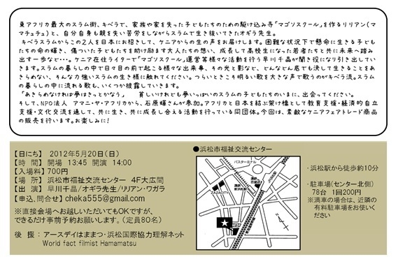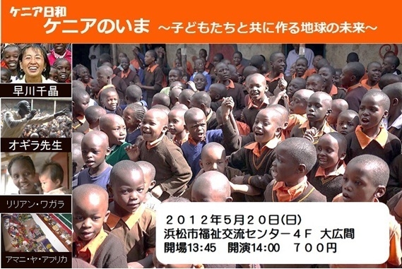 管理人様 告知失礼します アフリカ、ケニアのお話のイベントを開催します! ケニア日和Vol.4 「ケニアのいま 〜子どもたちと共に作る地球の未来〜」 【日にち】 2012年5月20日(日) 浜松市福祉交流センター4F大広間 【時間】 開場:13:45 開演 14:00〜 【入場料】 700円 【ゲスト】 早川千晶、リリアン・ワガラ、オギラ先生 【アフリカグッズ販売】アマニ・ヤ・アフリカ http://amani-ya.com/ 【後援】 World fact filmist Hamamatsu、アースデイはままつ、はままつ国際理解教育ネット 【交通案内】 浜松駅から徒歩1