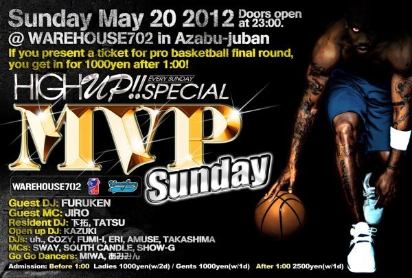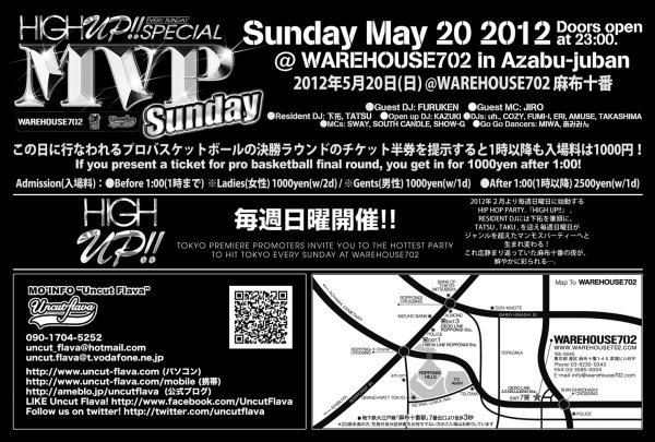 毎週日曜開催のイベントHIGH UP!! @ 麻布十番WAREHOUSE702! 貴重な日曜の遊び場です。 「日曜の六本木って開いているお店も少なくて遊ぶ場所がない」 こんな声にお応えして始まったイベントです! 今回はそのスペシャルバージョン! Uncut Flavaが毎年この時期に開催している年に一度のイベント「MVP SUNDAY」です! 【5/20(日) HIGH UP!! Special "MVP SUNDAY" @ 麻布十番WAREHOUSE702】 ★Uncut Flavaのお客様は、入口で「アンカットフレーバー」と言うだけで、1時以降も1000円でご入場いただけます! ★また、5/19〜20に都内某所