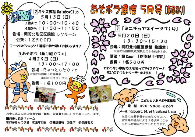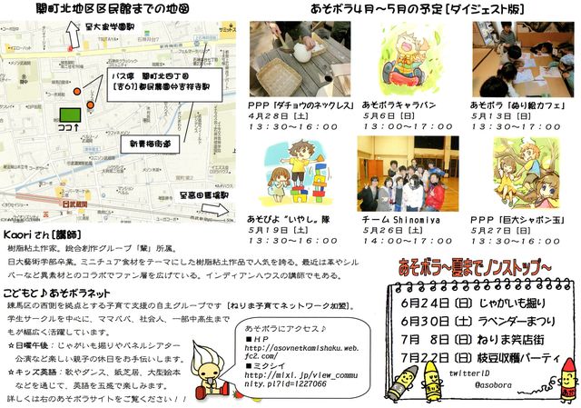 日祝日の親子の居場所 あそボラの日曜午後シリーズは目からウロコの企画満載で月1回開催中。 http://asovnetkamishaku.web.fc2.com/sundayafternoonseries.html ■やわらか粘土 こねこねが楽しい軽量樹脂粘土。 くだものからソースのマーブルまでリアルに再現します! しかも、 組み合わせしだいで自在に色を作り出すことができちゃう!! オトナにも「感触が癒しになる」と大好評です ■ストロベリーパフェ 季節のくだものたっぷりのフェイクパフェを作ります。 グラス