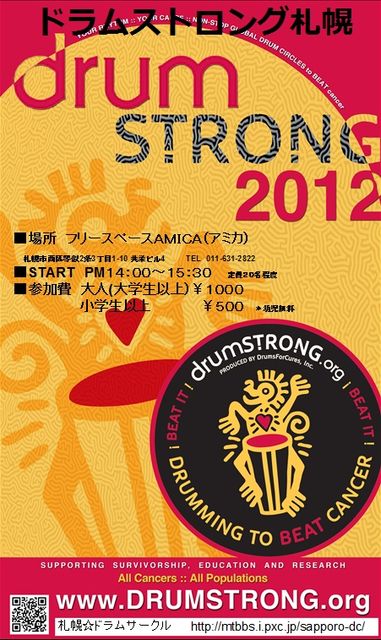 がん撲滅≪Beat it!≫世界中で同時ドラミング。 チャリティードラムサークル開催!! 「drumSTRONG」とは・・・http://www.orangeboomboom.com/drumSTRONG/ アメリカ、ノースカロライナ州シャーロット在住のドラムサークルファシリテーターでもあるスコット・スィマー氏によって創められたドラムサークルイベントです。 彼は、一般へのガン知識の啓蒙、ガン研究の推進、計らずもガンと共に生きる 事となった方々が、社会の中でその人らしく人生を楽しむ権利を守り、その為の社会基盤を整備する事を目的とした基金DrumsForCuresという基金