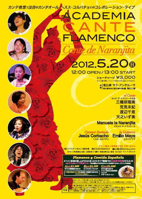 今週から恵比寿のスペイン料理レストランイベリアにて、 カンテのコンサートのシリーズが開かれています。 そのシリーズの最終日に当カンテ教室カンテデナランヒータも、 カンテ教室とスペイン人アーティストととのコラボ企画として参加します。 今回は、当教室の中でもカンテソロを学ぶクラスの生徒達4人と、 講師の私とで参加いたします。 尚、ゲストピアニストを招いて、ピアノ伴奏でも歌います。 ぜひ、カンテソロを楽しみにいらしてください。 (今回は踊りバック用のカンテを踊りなしで歌うのではなく、 生徒達もあ